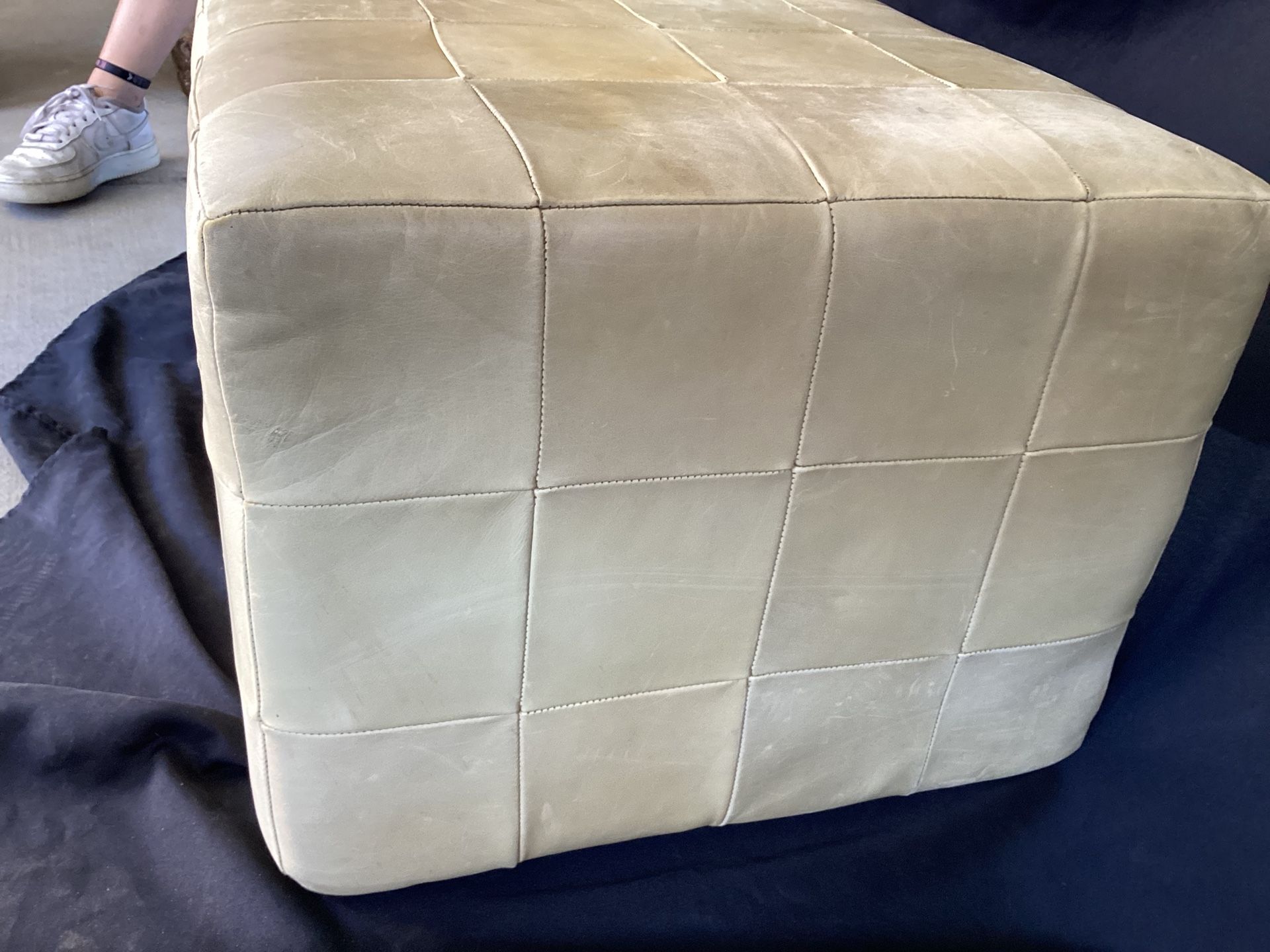 Leather ottoman 19 1/4” by 19 3/4” on top and 15” tall from ground.