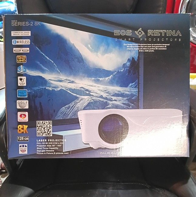 EOS Retina smart laser projector. The model number is a Series-2 8K. It's a full HD 8K UHD that projects a screen size from 60" up to 400". Daylight viewable with 8192 x 4320 pixels. 128 GB. Golf simulator ready. 3D ready and comes with 1 pair of 3D glasses. Also comes with a professional ceiling mount kit. MSRP is $4,799.00. It is brand new in the box and never been installed. Trying to come up with some quick money for Christmas presents. I'm asking $1,750.00 OBO.