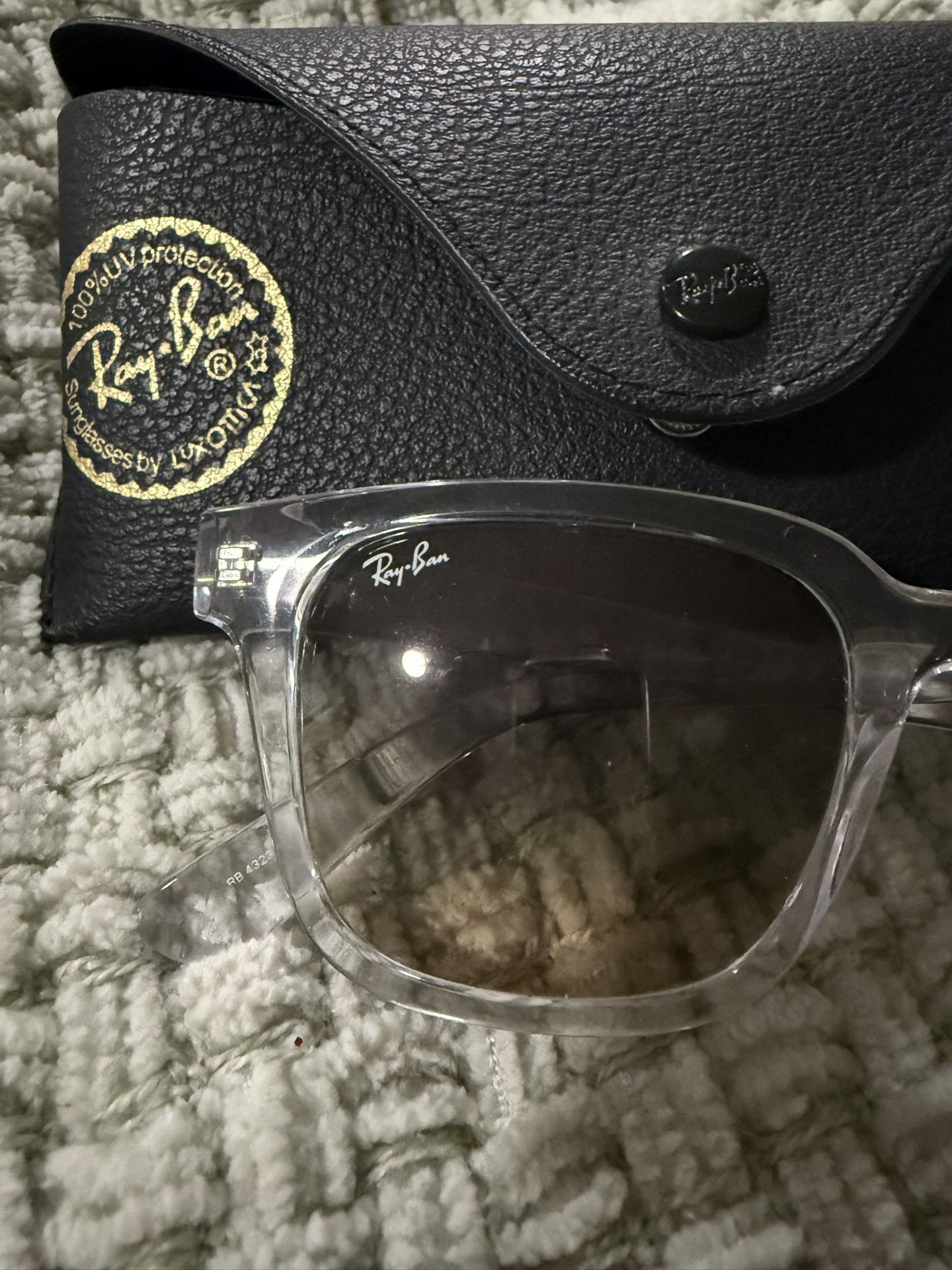 Authentic Ray-Ban sunglasses with clear frame. • Original Ray-Ban lenses with logo • Clear plastic frame • Clean lenses, no major scratches • Hinges are tight and smooth • Original Ray-Ban case included Used but well cared for. Local pickup Cash preferred.
