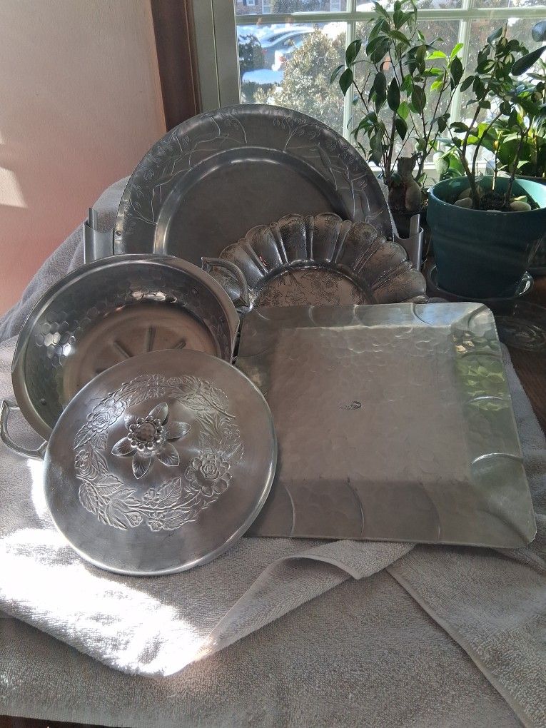 One 12" square tray One serving tray, 16" across including handles One round plate, approx. 11 1/2 " across One pot w/lid, holds approx. 9 1/2 liquid cups PICK UP ONLY, THANK YOU!!