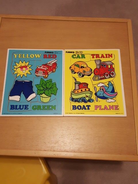 2 pressed wood puzzles, ages 2 to 6 years, each with 8 pieces.