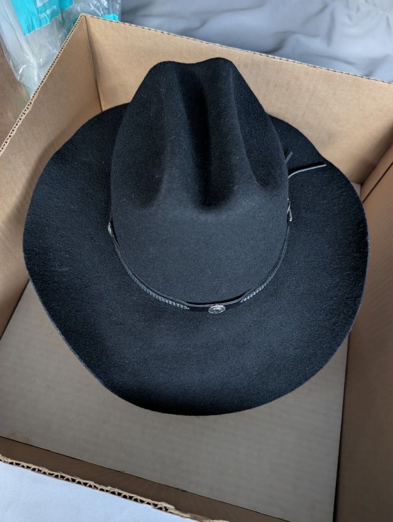 Very good condition. Could use a little steam for the brim. Size 7 1/4. Got for a costume a while back second hand. Hasn't seen much use. Comes with the original box as shown.