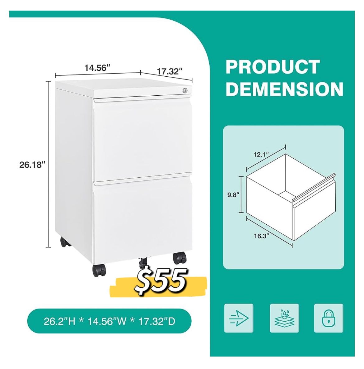😀 2 Drawers File Cabinet with Lock Metal Vertical File Cabient with Wheels Mobile File Cabinet for Office Home Legal/Letter/A4 Size, White, $55