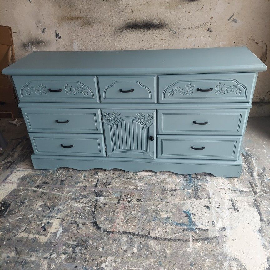 Dresser Cold Air Turquoise with Black hardware 61L X 17W X 31H 7 drawers-- Drawers depth-- 5" 2 Shelves *SANITIZED* REFURBISHED-SAND, PRIMED, PAINTED MINWAX POLYCRYLIC TOP COAT PET FREE/ SMOKE FREE HOME