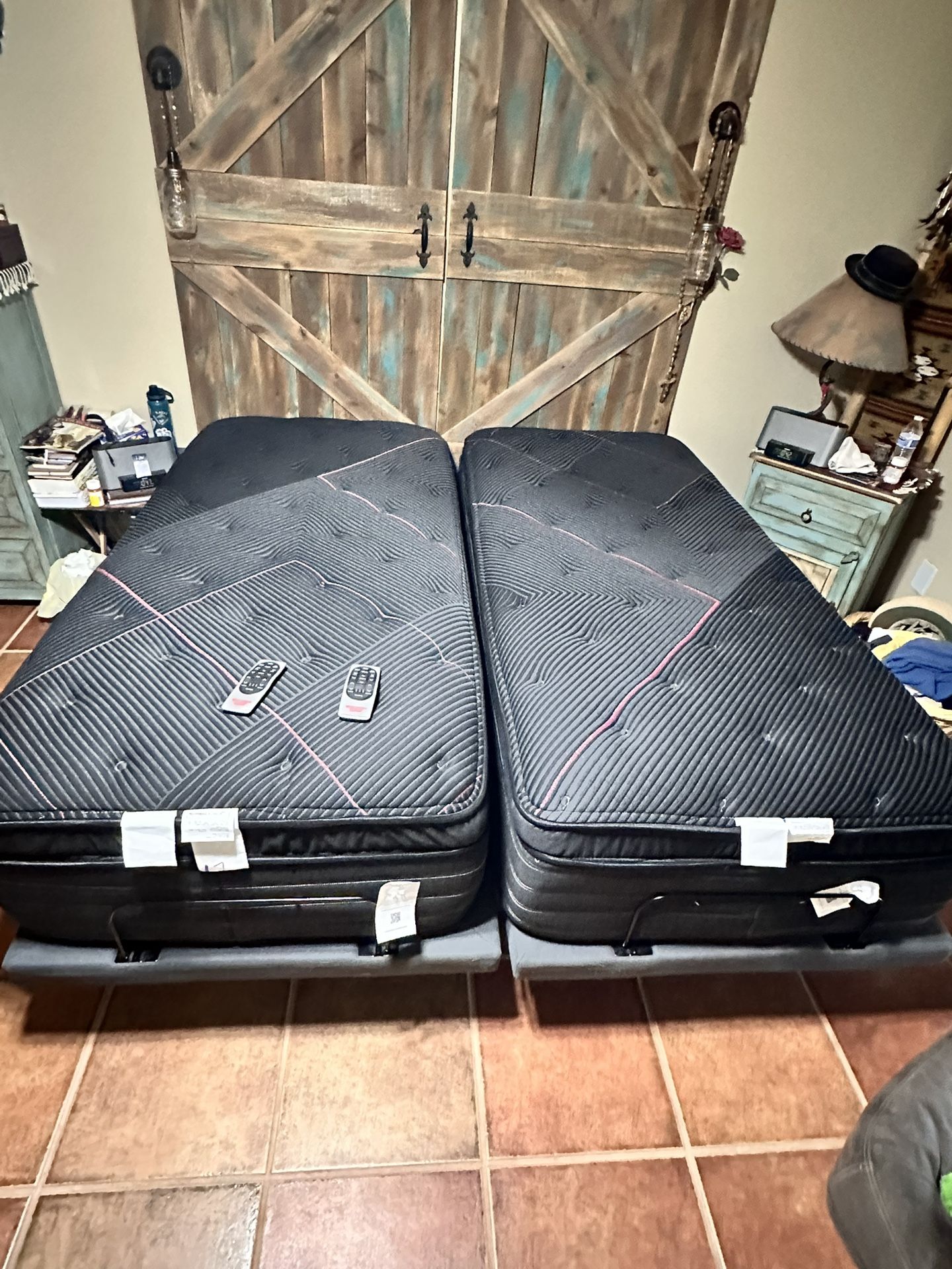 Two XL Twin (making it a King size bed when together) Split mattress with remote controls and protective covers. Softly used /Like New Mattresses are one year old and are in perfect condition. No wear or tears. Frames are also in excellent condition. Mattresses were never slept on without protective covers. No kids.