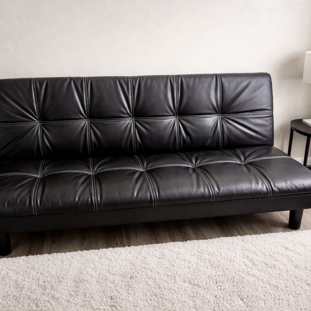 Modern black leather futon couch that easily converts into a bed. Perfect for small spaces, guest room, office, or apartment! Features: Reclines to adjustable levels Armrests lift up and adjust Converts quickly from couch to bed Sleek black faux leather with tufted design Easy to clean Comfortable and sturdy In good condition. No major tears or damage. Great for everyday use or as a guest bed. π Pickup only π΅ Asking $60 Message me if interested!