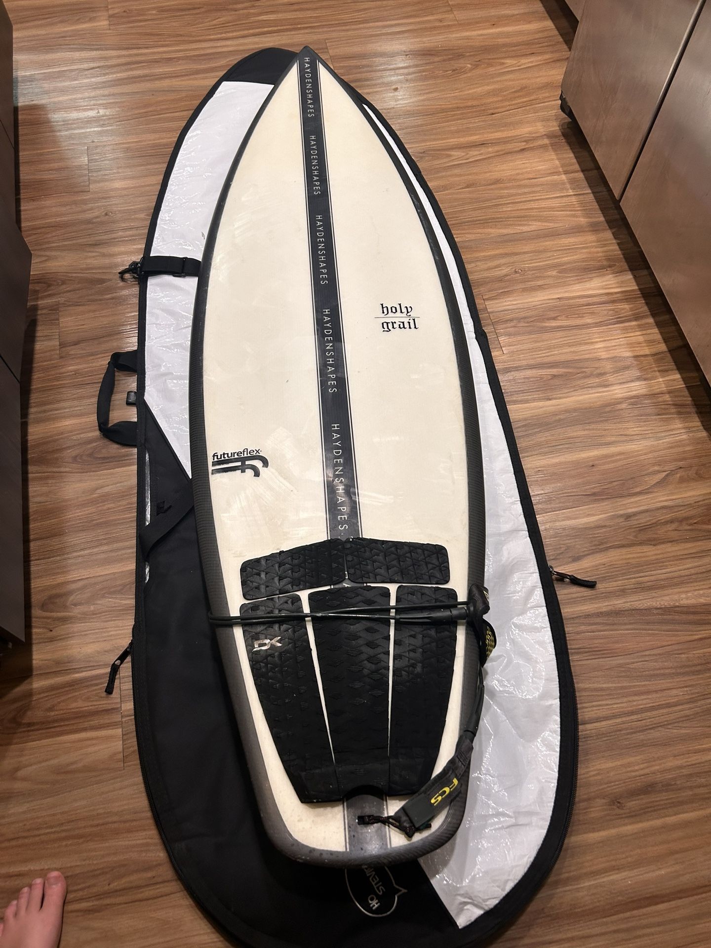 Hayden shapes Holy Grail 5’9” 20x2 1/2 29.5L future flex epoxy/carbon. Hayden shapes Holy Grail 5’9” 20x2 1/2 29.5L future flex epoxy/carbon asking $400 Bought in 2021 some wear but rarely rode it. Great condition. Carbon fiber rails! Maybe a few pressures from normal wear but can see them. Hasn’t yellowed. Comes with a fresh HoStevie shortboard bag, fins, leash. Wave fc fans: this board was once used as a cheeseboard for Kailen sherridans baby shower. See last photo.