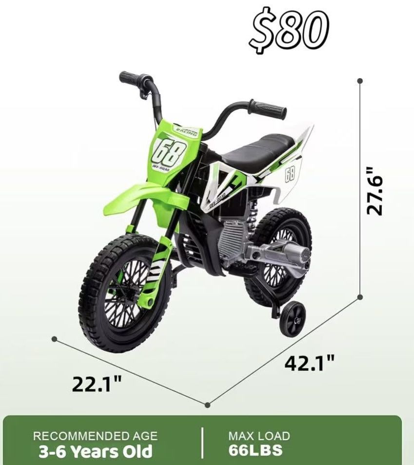 12V Electric Kids Motorcycle, Ride on Motorcycle with Twist Grip Throttle, Treaded Tires, Training Wheels, Music, 3.1mph Top Speed, Ages 3-6 Years Old, Green 🙏pay $80.00 + sale tax by cash or card in person (final sale). ✌️Not Accept price negotiation through thIs OfferUp App ; The price is as marked ✌️Pick up at showroom : zip code 80231(😀) or 80223(✌️) or 80241 (🥨)depending on item ✌️Hour : from 10 am to 7 pm(Monday CLOSE) ✌️Pick up at showroom, No shipping, LIMITED delivery option ✌️ ‘’LIMITED Delivery option ‘’ may be available with ‘’EXTRA charge’’ . Please consult ‘’BRICK-and-MORTAR STORE IN PERSON’’ for delivery option & ‘’ EXTRA charge incurred from delivery “.( Can’t provide delivery details through OfferUp App due to complexity.) ✌️please stop by ASAP after all info(including address) provided OR ✌️double confirming “available or not” again if the address info is already provided for days.. 🙏can NOT relocate inquired item to other showrooms but you can wait to see if it is available in other showrooms (current item location zip code can be distinguished by 🥨😀✌️) ✌️ ALL furniture are new and not used at all. However, due to few careless or overweight handling during shipping, transport or assembly, few of them will have mild scratch or dents. So does some inventories in the box. We try our best to photo those in pictures after assembling them. The price is adjusted based on those issue that we notice. ✌️ Item sold as the picture (it is assembled ) or it will be mark as in the boxes 🥰Reminder: Please pay attention to the address I send you. NOT all showrooms carry the item you inquiring. There is higher chance the item may be ONLY available currently in this Specific ADDRESS I send you. If you inquire multiple items, they may be located in multiple different showrooms…please pay attention to address. 🙏 You are welcome to ‘’GENTALLY CHECK ’’ items/ Furniture in PUBLIC showroom before deciding to purchase it or not. 🙏NO RETURN, NO REFUND, NO EXCHANGE