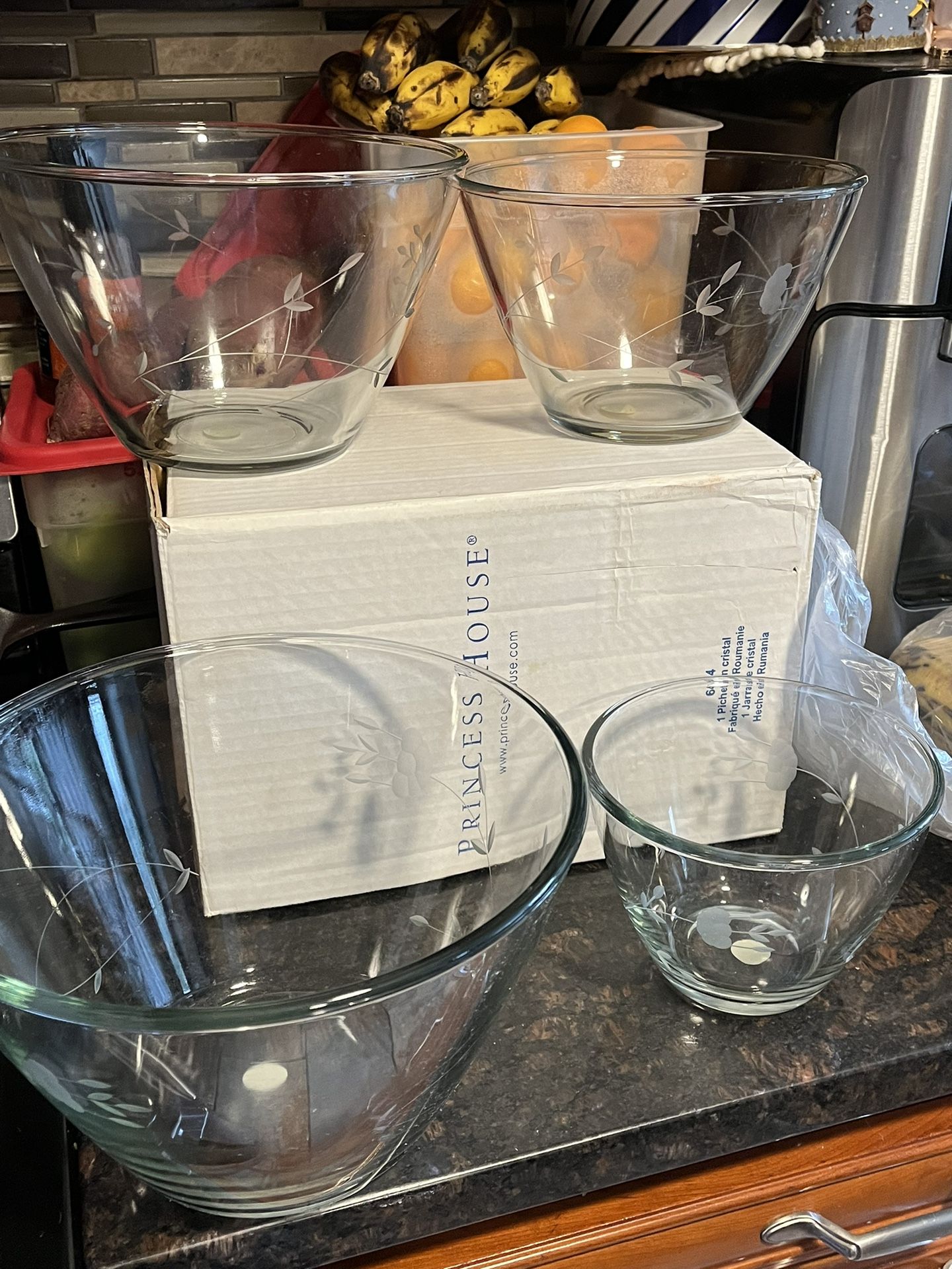 This item was only made available for a short time. Collectable!!!!! Dishwaher safe 1 Small Bowl 1-Qt 4-1/2" high 6-1/8" diameter 1 Medium Bowl 2-Qt 5" high 8" diameter 1 Large Bowl 3-Qt 5-5/8" high 8-7/8" diameter 1 Extra Large Bowl 4-Qt 6-1/8" high 9-7/8" diameter MINT Condition - in the ORIGINAL BOX MADE IN THE USA This item is in MINT CONDITION with NO defects OBO
