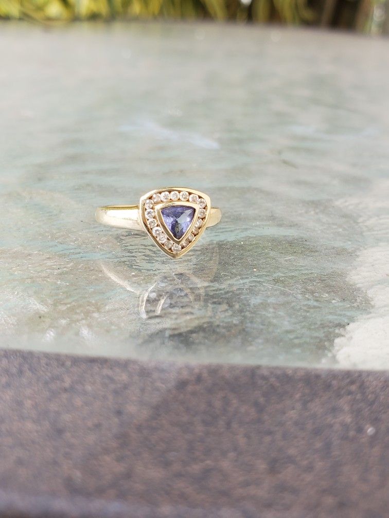 Check out my other ring for sale! Beautiful Diamond and Tanzanite Gold Ring. Size according to image is 4 3/4. Sorry NO box. It is a small ring but UNIQUE! Ring has been used so NOT in new condition. Needs a cleaning and may have thin hairline scratches. Please check all photos carefully and zoom in. I cannot find the 14k stamp as this was sized down for me many many years ago, so may have lost that section. I feel pretty sure its 14k. In the last photo I compare to my other 14k gold ring which does have 14K stamp( also listed for sale). Ask any questions! See my other items for sale!!