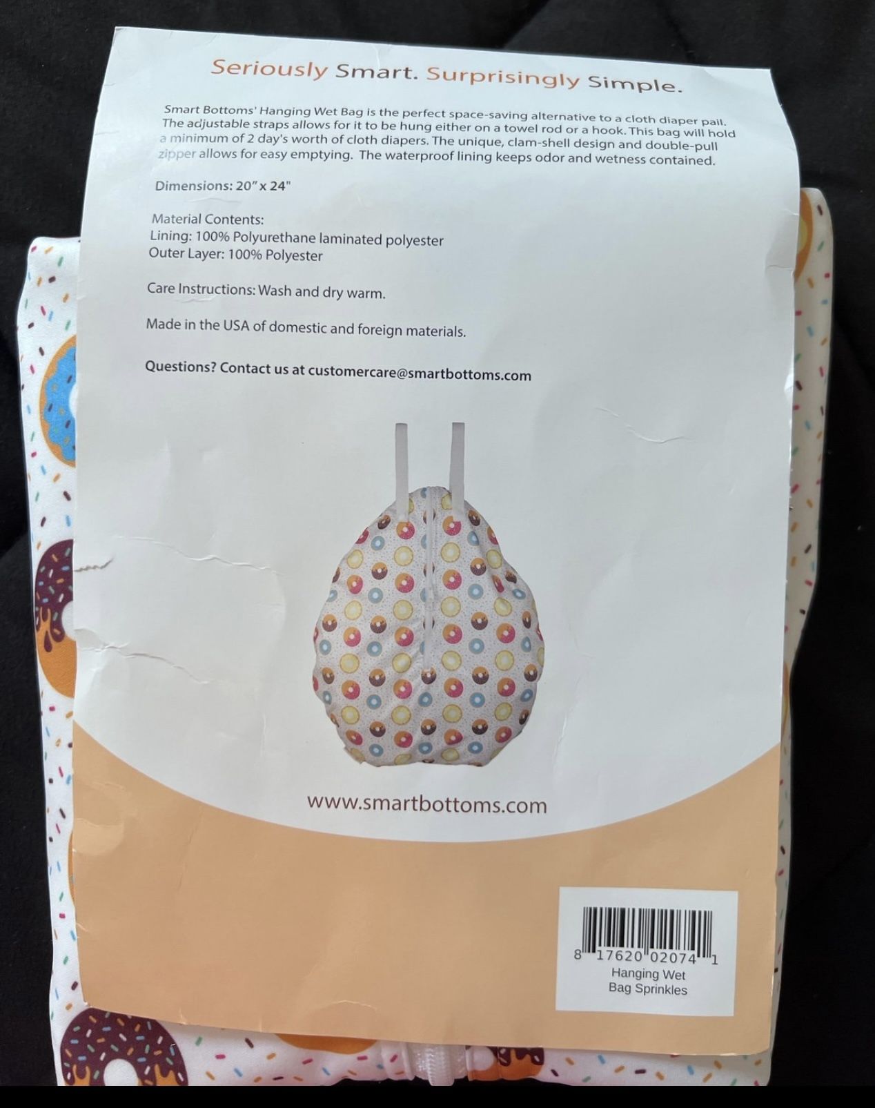 Hanging wet bag for baby diapers or other items. Zipper on both sides to open wide. Straps for hanging.