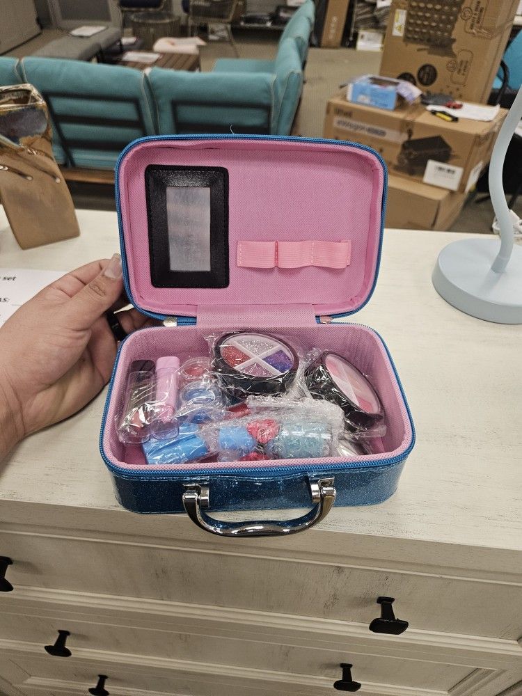 Fun kids pretend makeup kit with glitter carrying case. Includes brushes, lip gloss tubes, eyeshadow palettes, nail polish bottles, and accessories. Perfect for dress-up, birthdays, and creative play. Comes in a sparkly blue case with handle and mirror inside. Great gift idea. We are located at: 11310 Cantu-Galleano Ranch Rd Jurupa Valley, CA 91752 Business Hours: Wednesday–Friday: 9:00 AM – 5:00 PM Monday & Tuesday: Appointment Only Message us to schedule a pickup or confirm availability before arriving. We look forward to serving you!