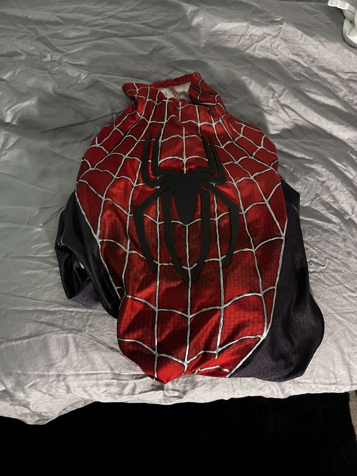 Custom Sam Raimi spiderman costume with traced lining to make the silver pop out. Comes with built in padding at the bottom of the feet that work as shoes. Comfortable, fun, and perfect for Halloween. It was an old project so not all lines are finished but it’s hardly noticeable and looks great regardless. Does not come with mask, but if you need me to try it on to see a life size figure, i’d be more than willing too. I’m 5’11 and fits me well and tight, is flexible enough to fit other body dynamics.