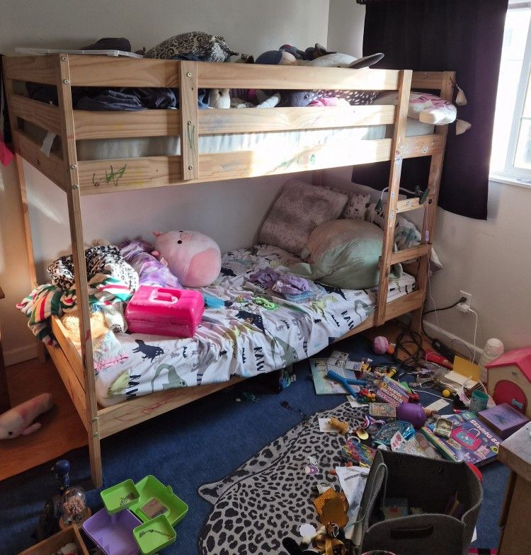 Bunk Bed without mattresses. This is an Ikea Mydal bed. Currently disassembled into four main parts and some connecting and stabilizing pieces. This has been colored on and there are stickers on it. Description and assembly instructions: https://offerup.com/redirect/?o=aHR0cHM6Ly93d3cuaWtlYS5jb20vdXMvZW4vcC9teWRhbC1idW5rLWJlZC1mcmFtZS1waW5lLTAwNTMxODkxLw==