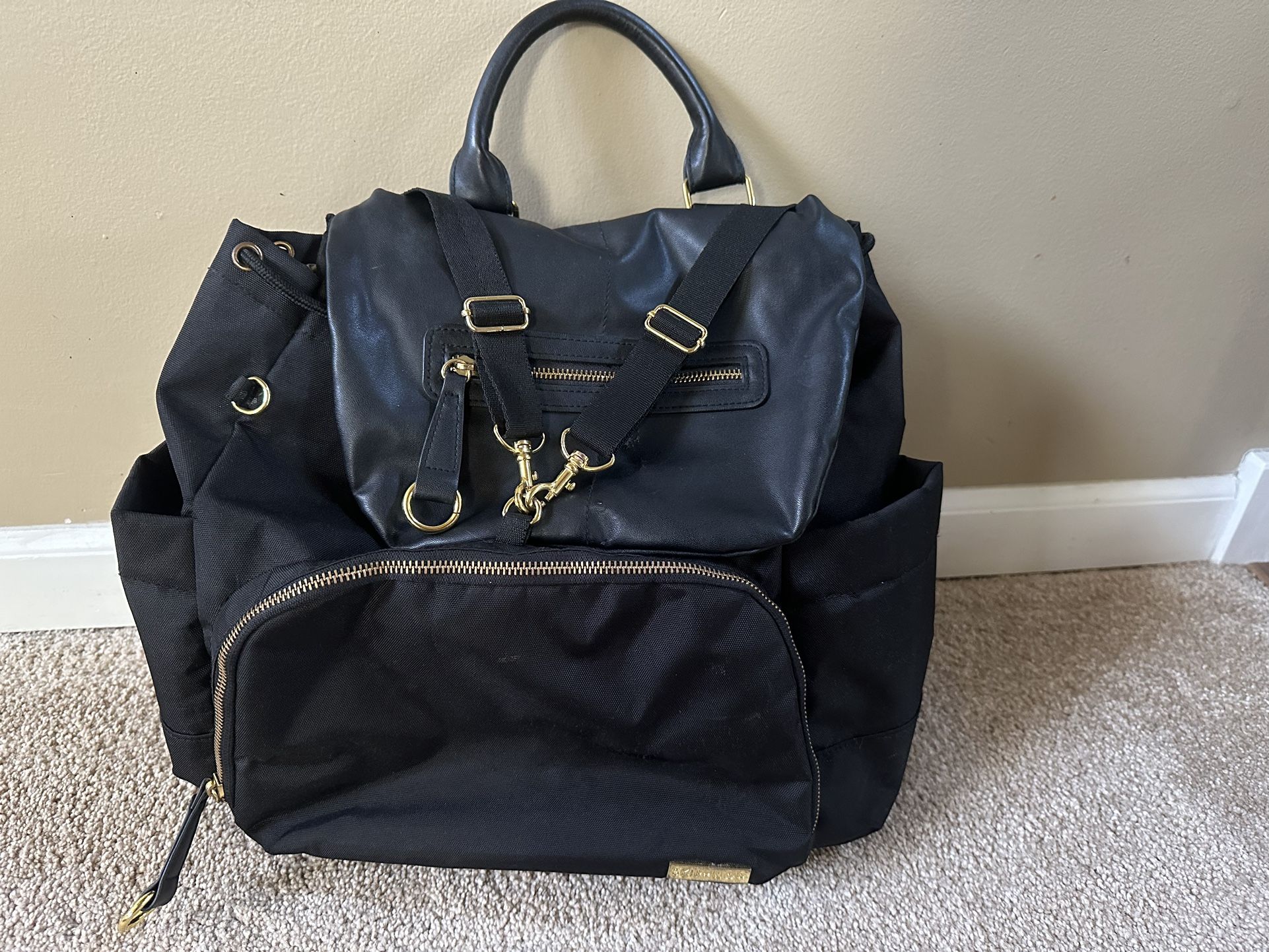 Black Skip Hop wide open diaper backpack. Very good condition. A little work spot on the front flap.