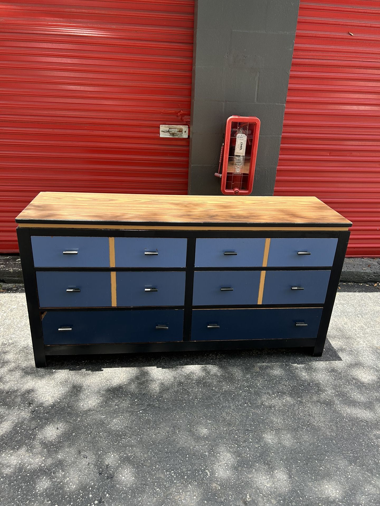 One bottom drawer has a corner chip out other than that is in good condition drawers work smoothly with no issues. 62x18x32(tall)
