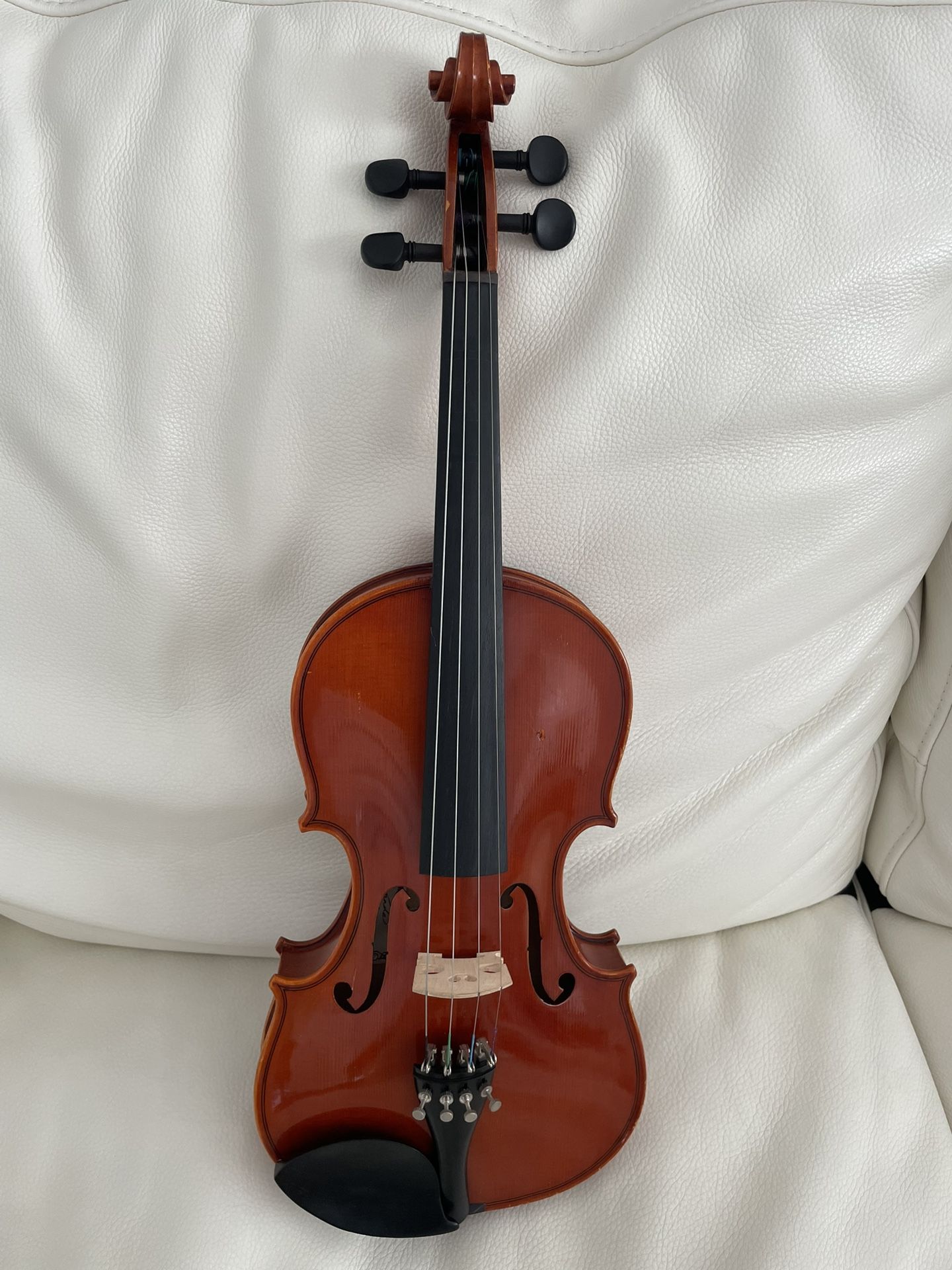 In good working condition with excellent ringing sound. Has small hairline crack near left f-hole that doesn’t affect sound. Tuned and ready to play. Price includes violin, bow and case.