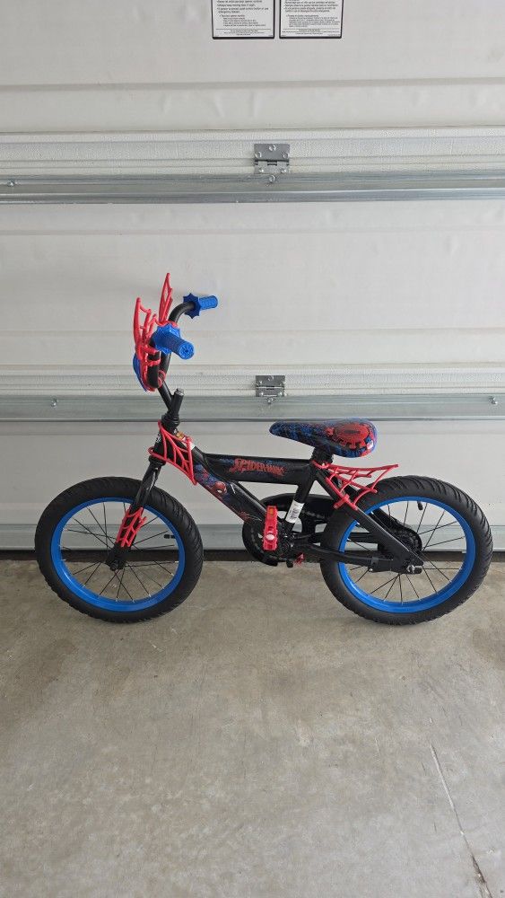 Spider-Man themed kids bike by Huffy in excellent condition. Barely used and kept in the garage. ✅ Cool Spider-Man design with web-style handlebars + rear rack ✅ Bright blue rims + thick tires ✅ Rides smooth and looks awesome in person Perfect starter bike for a young Spider-Man fan.
