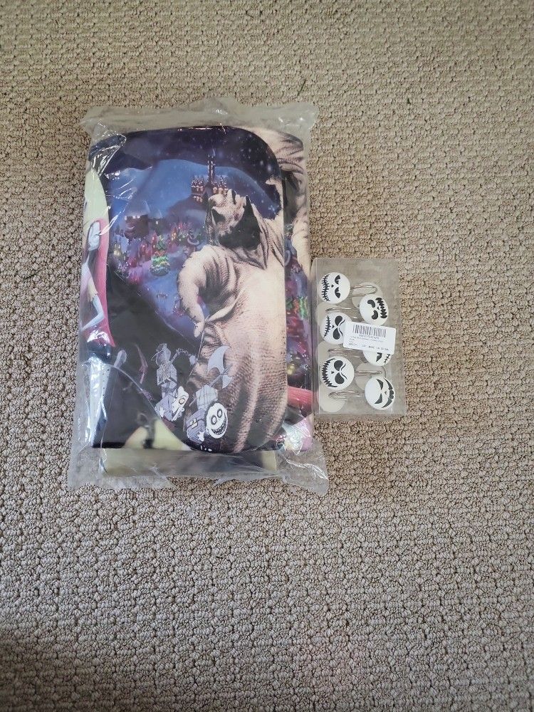 Brand new Nightmare before christmas bath set, includes shower curtain, Jack Skellington curtain hangers, and bath mat.