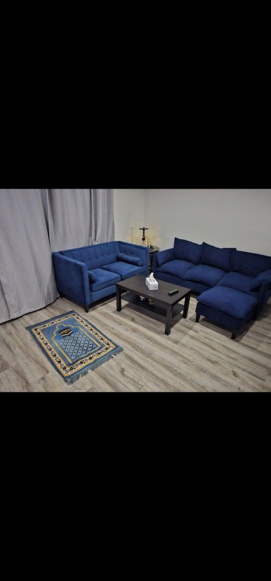 Beautiful blue velvet sofa set, 2 matching couches in excellent condition. Very clean, comfortable, and well maintained. Perfect for living room or apartment setup. Prefer to sell as a set, but may consider selling separately for the right price. Pickup only. Serious buyers please.