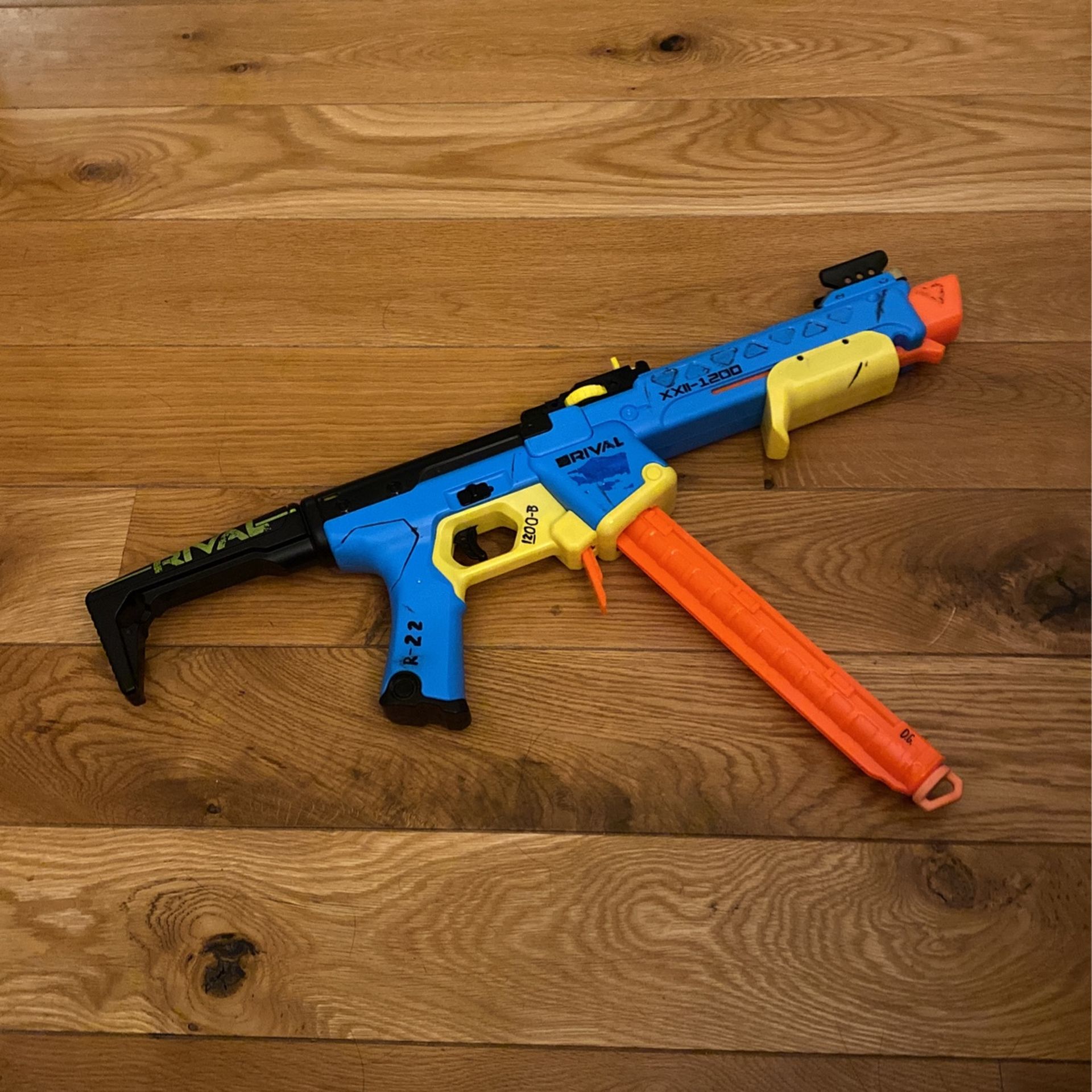 Pump action high power nerf rival blaster reaching up to 100 FPS. Magazine fed with adjustable sights. Magazine holds 12 rival rounds. RIVAL ROUNDS NOT INCLUDED.