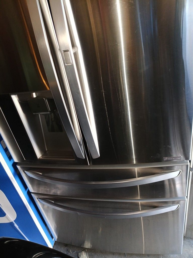 Extremely nice and spacious refrigerator! French /four door. It has the middle drawer as well as bottom freezer drawer. Has Ice maker, water dispenser, a beverage door, extra keep fresh cubby spaces in refrigerator. Width 36" depth 36"