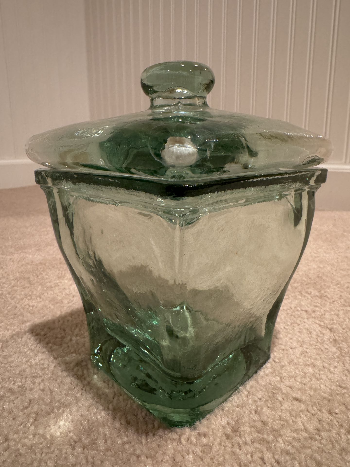 Beautiful green glass container Thick durable glass Perfect for bathroom storage or elsewhere in the home No chips or cracks Measurements: 7” H (including knob) 5” H (container without lid) 5” W at top 3.5” W at base