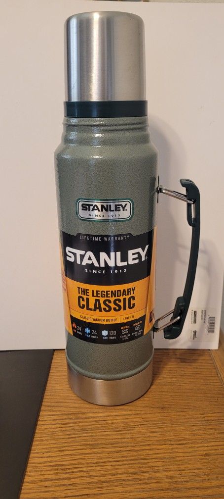 New, never used Stanley Thermos Bottle with wide mouth cap and cup. Keeps food hot or cold up to 24 hours long.