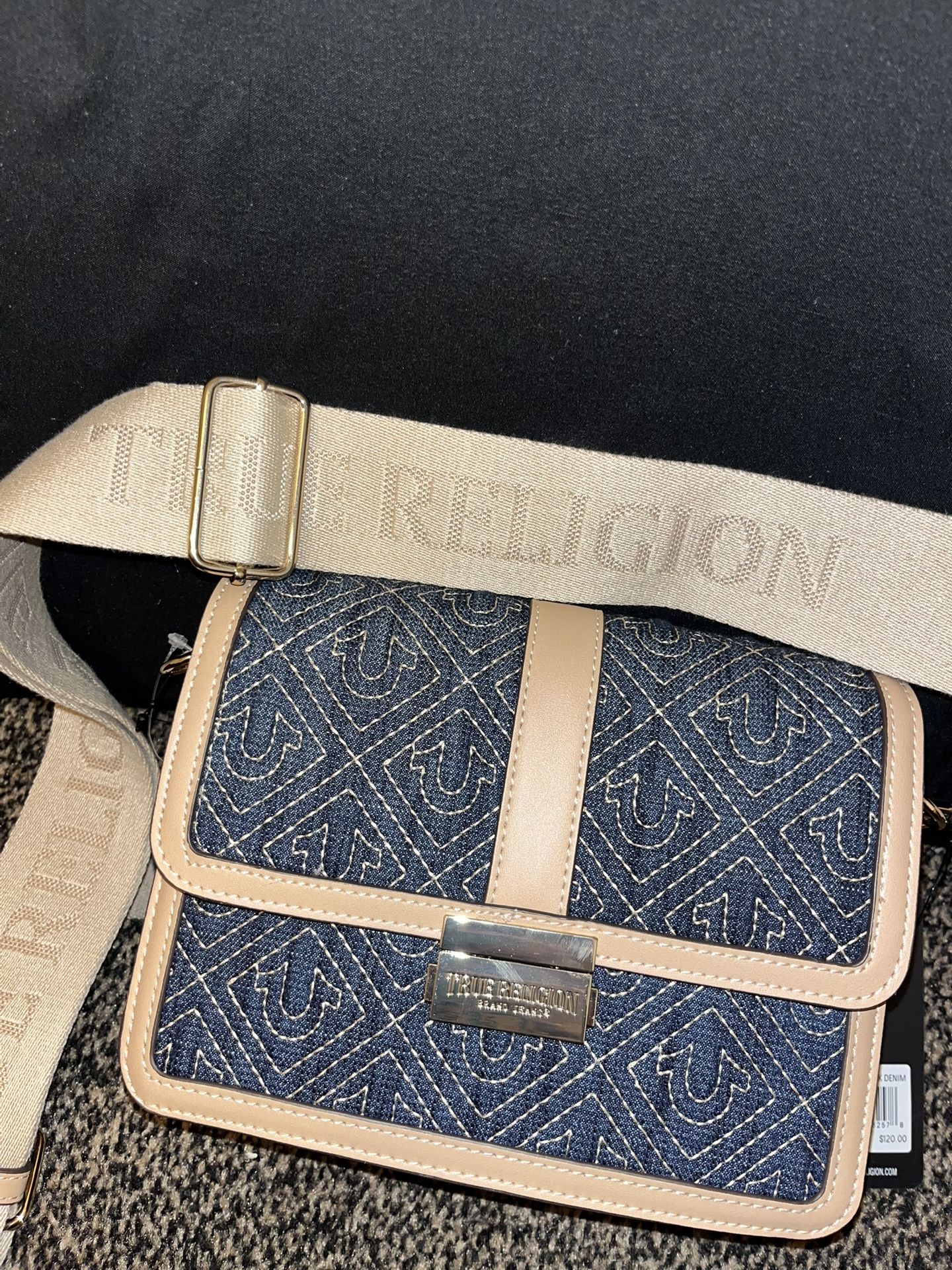 Brand New ! Retails for $120.00 Price is $70 firm Pick up in Richardson area 75081 Cash only Product Details Brand: True Religion Style Number: TNFB0285 Color: Dark Denim Material: Exterior is denim with faux leather trim and strap handles. The lining is polyester. Features: The bag has a magnetic snap closure and an adjustable/removable cross-body strap.