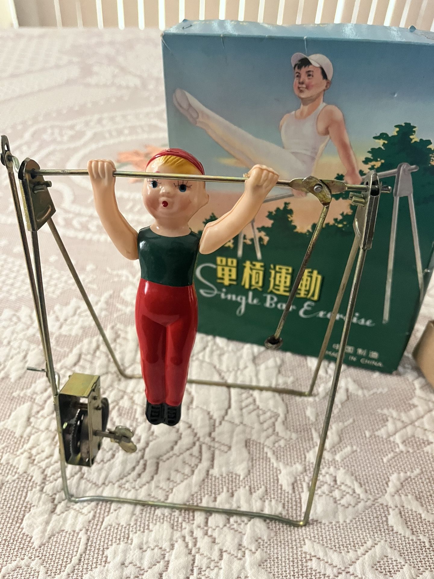 Vintage 1960’s “Single Bar Exercise” toy with wind-up mechanical action.