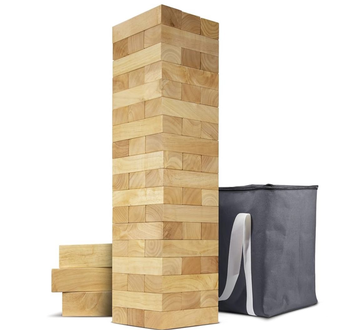 GIANT SIZE: Tower starts at 2.5 ft tall and grows to over 5 ft during play; Includes 54 giant blocks (18 rows), carrying case and custom rules board; Each block measures 7.2 x 2.4 x 1.5 inches TROPICAL HARDWOOD: Ultra durable solid wood blocks highlighted by a warm tropical woodgrain look PREMIUM QUALITY: High quality hand sanded and varnished tropical hardwood blocks CARRYING CASE: Includes robust canvas carrying case for easy portability and storage of blocks and accessories MUST HAVE PARTY GAME: Great for indoor or outdoor fun with family and friends