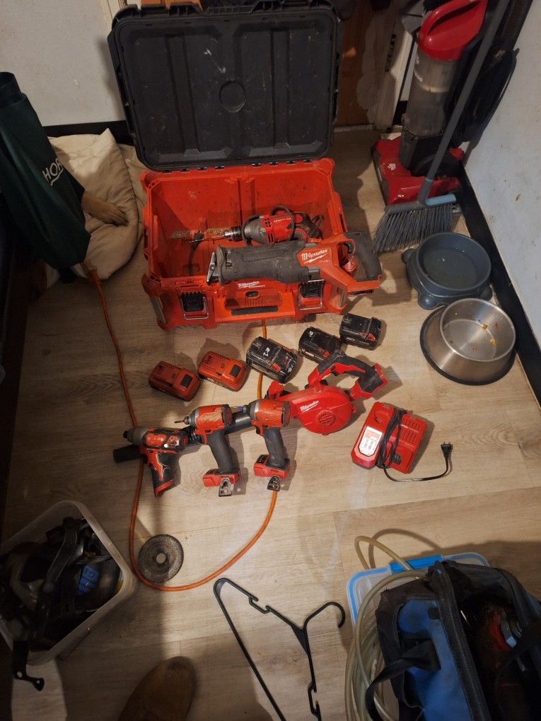 3 impact drivers 1 Sawzall 1 blower 1 hammer drill 6 batteries, 2- 6.5, 1-5.0, 1-6.0 HO, 1-8.0, and 1 12v extended 4.0 1 Packout