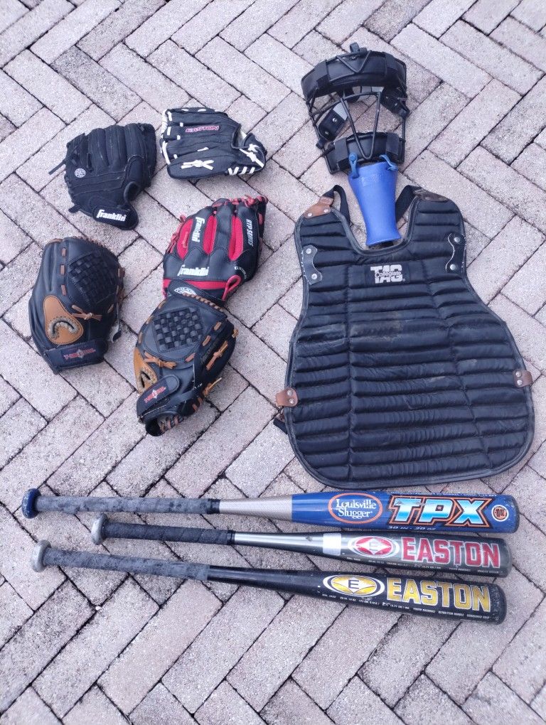 Three baseball bats, five catchers mitts, umpire chest protector, and mask softballs included. Added some extras football divers snorkel mask etc. flexible with the price . Cash only