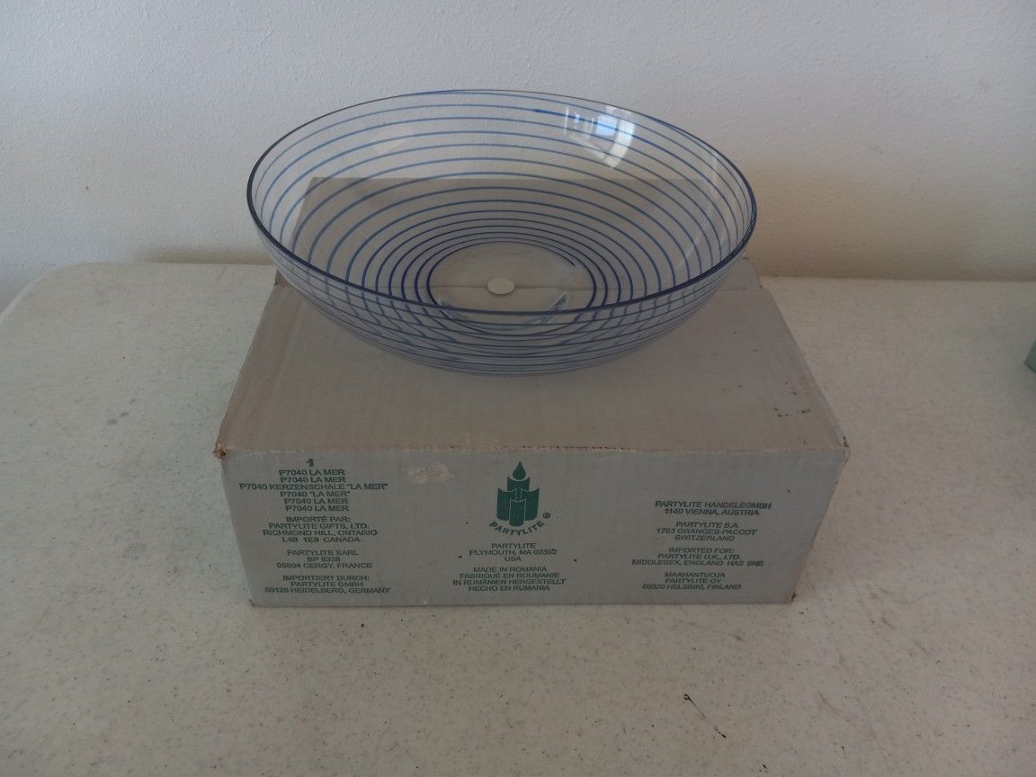PartyLite Glass Bowl Accessory Le Mer P7040 Clear Glass with blue spiral stripe. Accent piece, centerpiece base, pillar candle holder, serving dish, etc. 10" across, 4" tall. Used as display piece with their ocean themed pieces. Bottom label shows wear but dish is in like new condition. Happy to answer any questions, just ask. If shipping requested, will pack well, not responsible for any damage occurred in shipping/transit. If an option, item will be insured.
