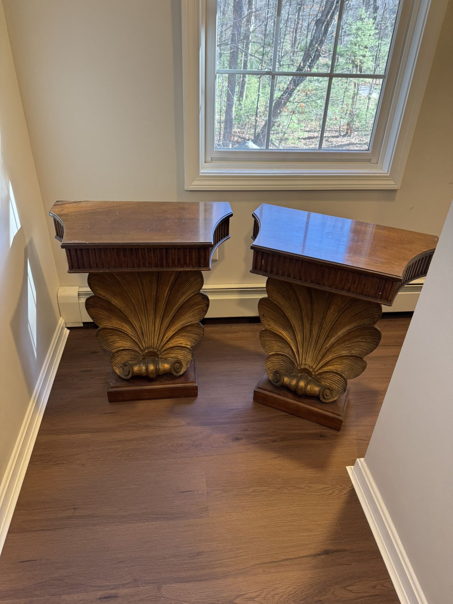 Beautiful pair of vintage-style pedestal end tables or nightstands featuring striking carved shell bases with a warm, gilt finish. Each table is topped with a rich wood surface and a single drawer for convenient storage. The sculptural bases make these pieces true statement accents—perfect for a bedroom, living room, entryway, or flanking a sofa or console. These tables have a classic, timeless look that blends traditional and coastal-inspired design. Solid and well-crafted, with light surface wear consistent with age and use, adding to their character. Details: Sold as a matching pair Decorative carved shell pedestal bases Single drawer on each table Warm wood tops with elegant curved edges Ideal as end tables, nightstands, or accent tables A unique and eye-catching set that adds charm and sophistication to any space.