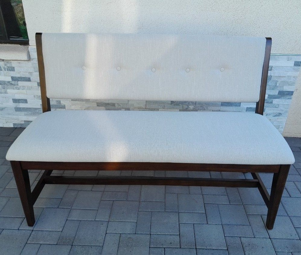 New Dorval 50" Bench with Back Wood and Fabric Mid-century Modern Style Cherry Wood Finish Off White Fabric Seat and Back Dimensions: 34.5 H x 50" W x 21.5 D Asking: $185 Cross streets are Apache and McClintock in Tempe **Delivery Available**