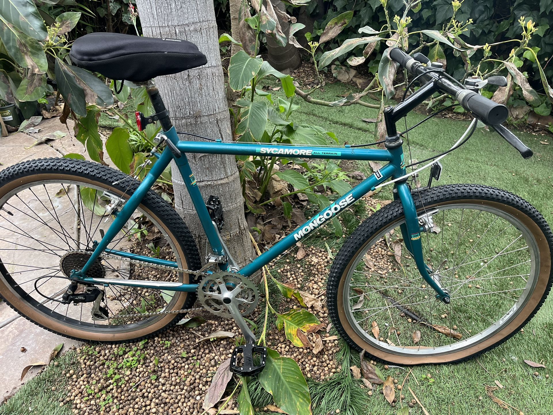 Vintage 1989 Mongoose sycamore 24 speed mountain bike. 18 inch chromoly frame and fork, alloy wheels with new tires, Sakae alloy crankset, Shimano Deore cantilever brakes, and brake levers, Shimano friction shift levers and derailleurs, has new chain, new tires and grips. Seat has new Bontrager seat cover. Paint is in great shape. All tuned up and ready to ride. $150 firm