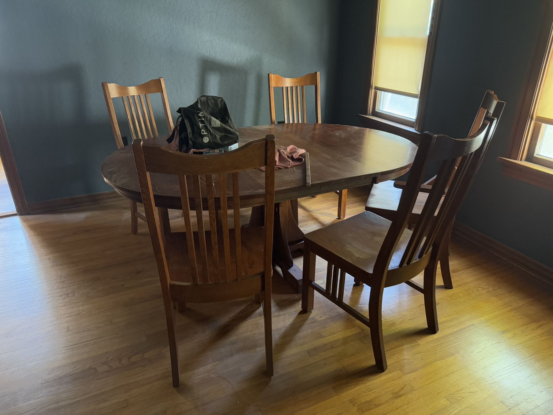 Sturdy wood dining room table. Has leaf insert (shown in photo) easily moveable. 6 matching chairs. Please look at photos for measurements Must be able to load alone. OBO