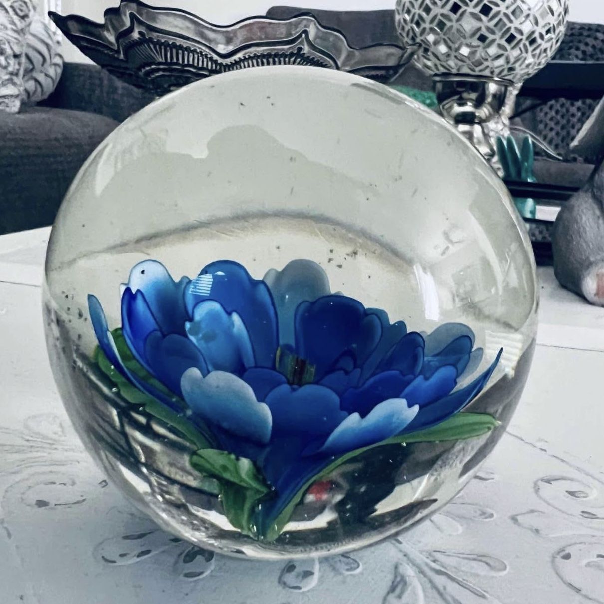 A gorgeous vintage paperweight. Round clear glass featuring a single blue flower inside. Use this paperweight for your home office or office desk. Beautiful dimensional flower. Measures 3β high Preowned and in good condition *Comes from a smoke free home *Cash only *No returns or exchanges - All sales final #paperweight #floweringlass