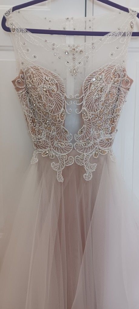 Embellished evening gown. Worn once. A few pearls missing. See all photos for detail.