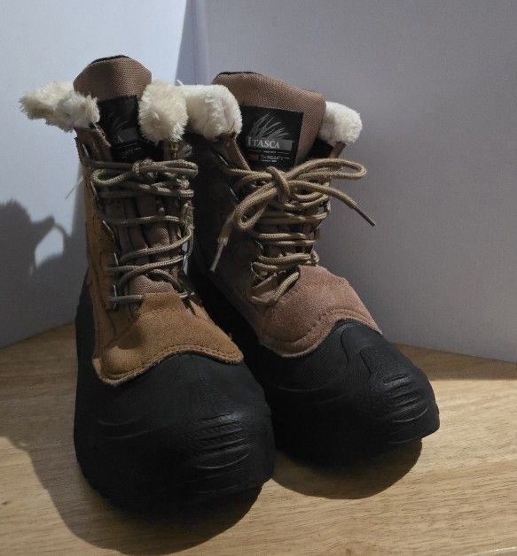 These boots are in very good condition but fir the right boit is missing some of the top fur. Look at all the photos for condition. They need new shoes laces. The price has been adjusted for these defects