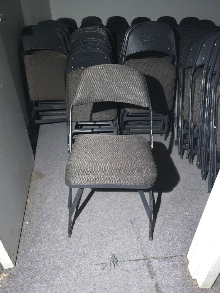We have about 180 of these Clarin "4400 Series Folding Chairs" available for $30 each. These chairs have a retail price of $336. These commercial chairs measure at 18"W x 21"D x 32.75"H. When folded up to store, they are 39.5" tall. They have a seat height of 18.5" which should allow these to sit under most standard sized tables and desks. These are made of ash black 19 gauge steel and are upholstered in brown colored cloth fabric. The chairs can be folded for easier storage and transportation. They also have "Dallas Convention Center" etched on the backs. These chairs will vary in condition but overall these are going to still be very usable and may just need a wash. Recycled Furniture here in Irving has these and several other types of chairs to look at. Feel free to contact us for more info.