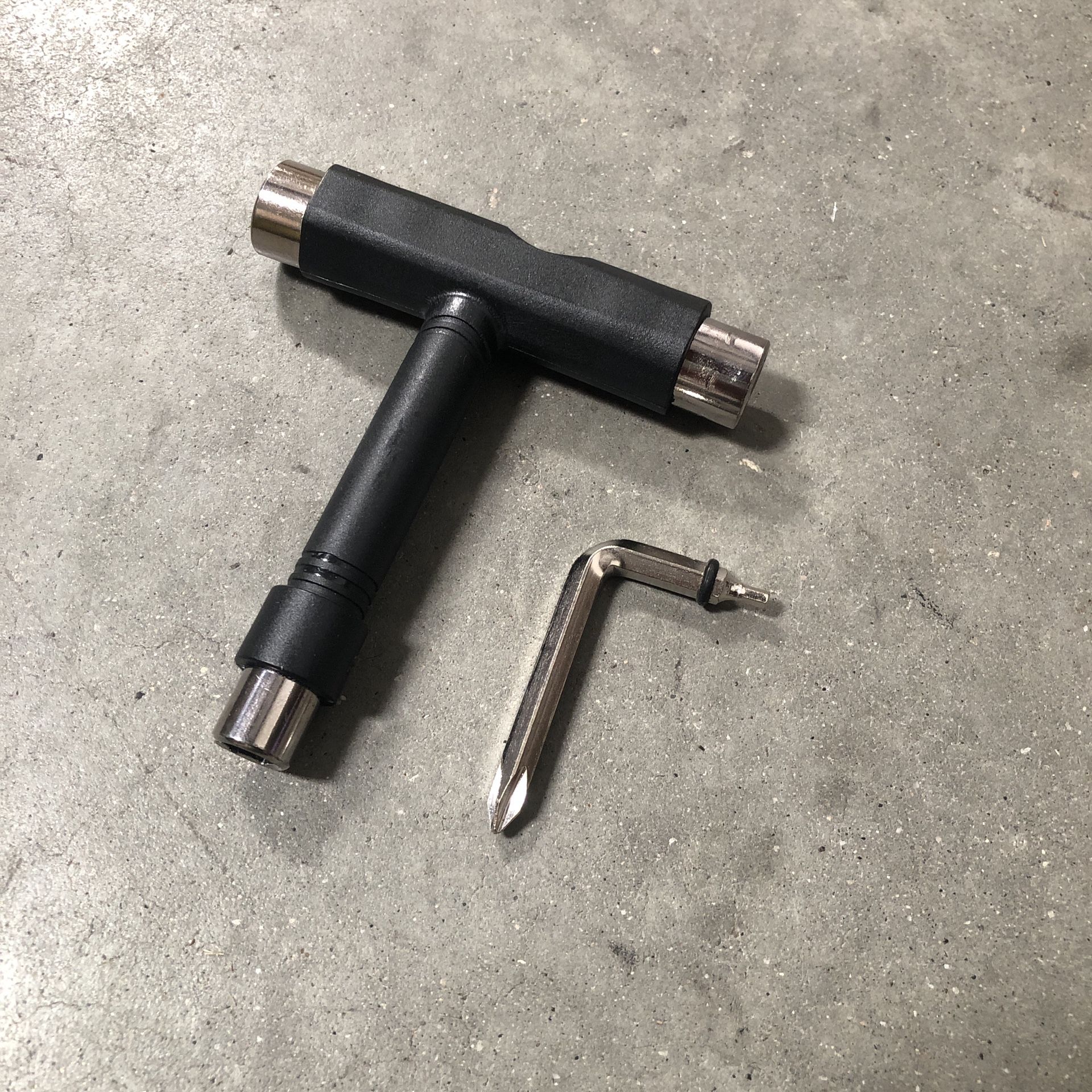 Works on most skateboards. T shape has 3/8", 1/2", and 9/16" sockets, and a removable L shape allen / Phillips head screw driver. Brand new!