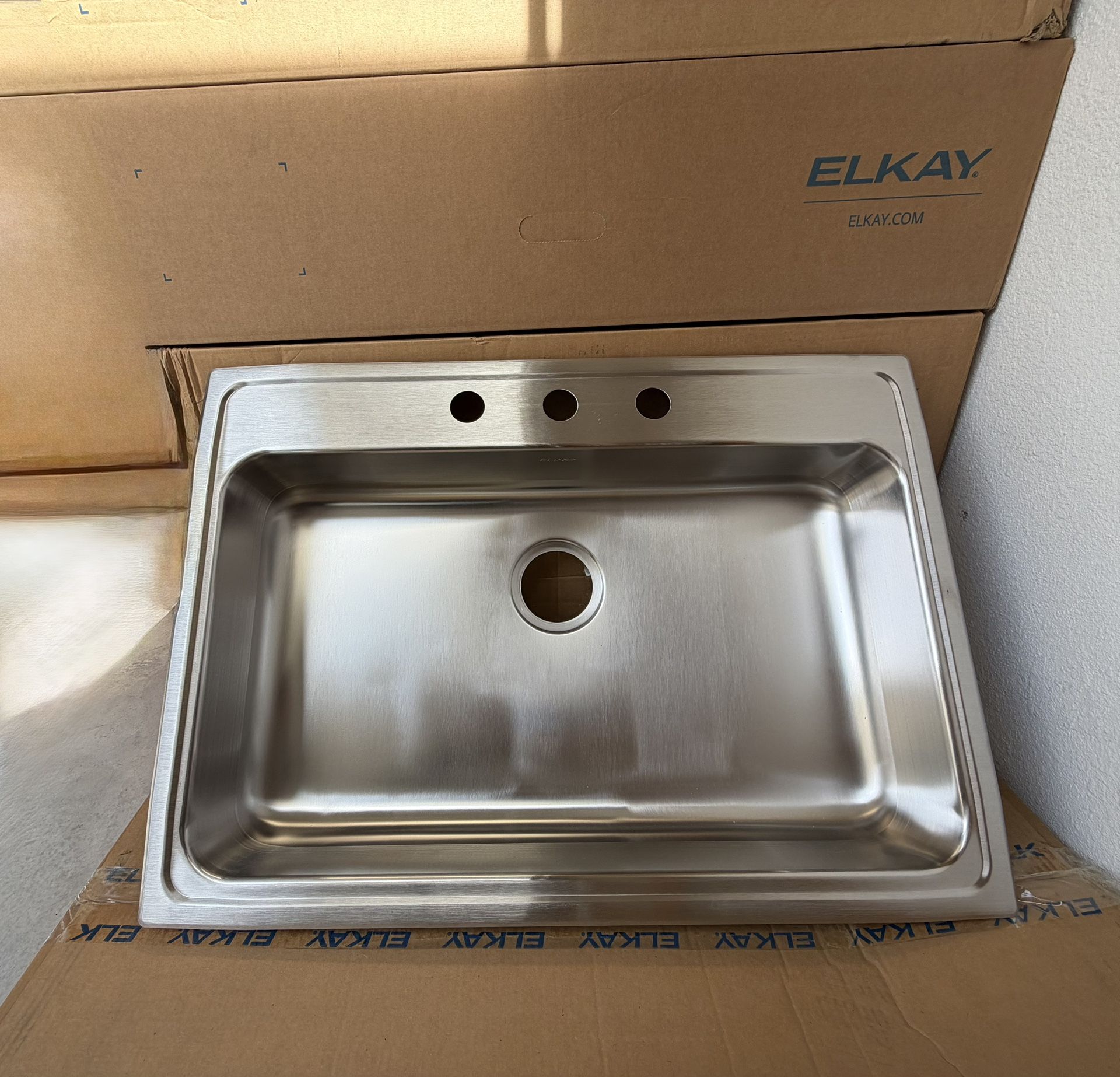 ELKAY Model # LRAD(contact info removed) New Elkay Lusterstone Classic drop-in kitchen sink. Stainless steel, single bowl design. Measures 31-in x 22-in and is 18-gauge. Has 3 holes for faucet setup. Still in box