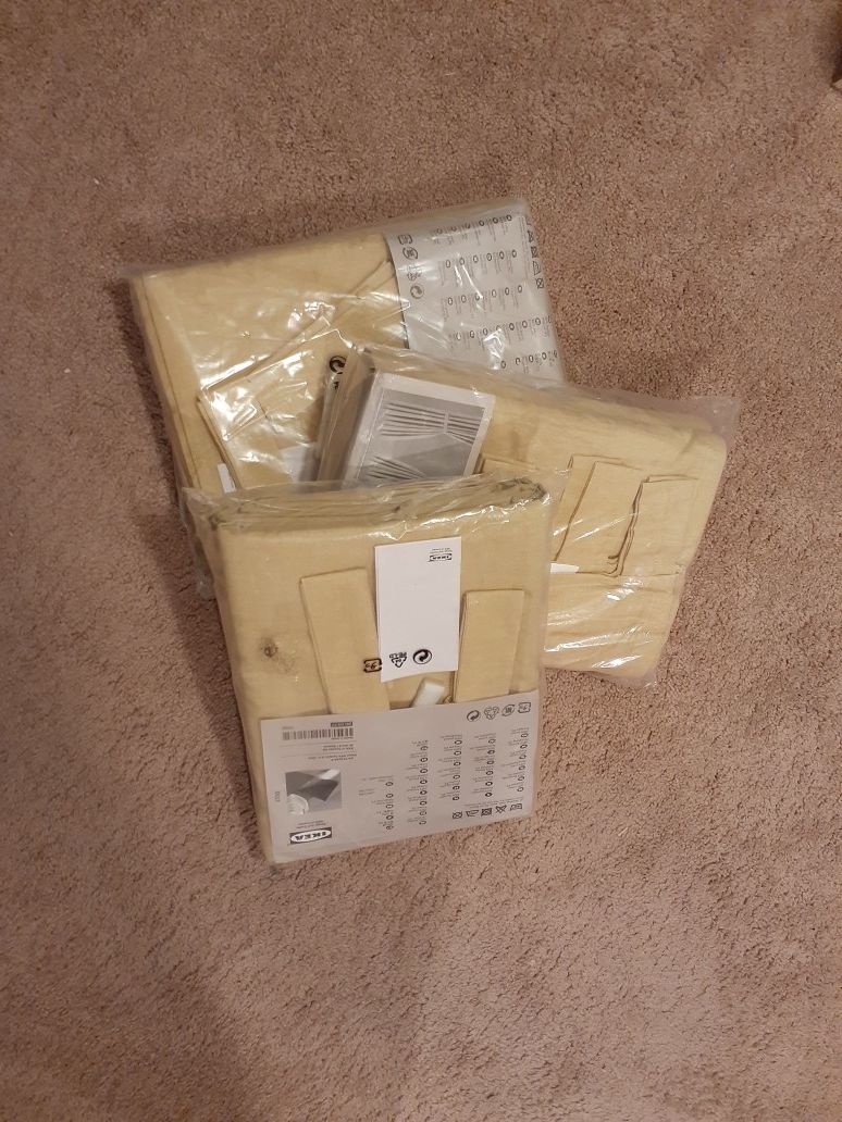 Ikea curtains new still in the package sales of $45 each. My price for all 3 packs was $75 for all of them. each pack come with 2 curtains in each! So $50 for all 3 pack's