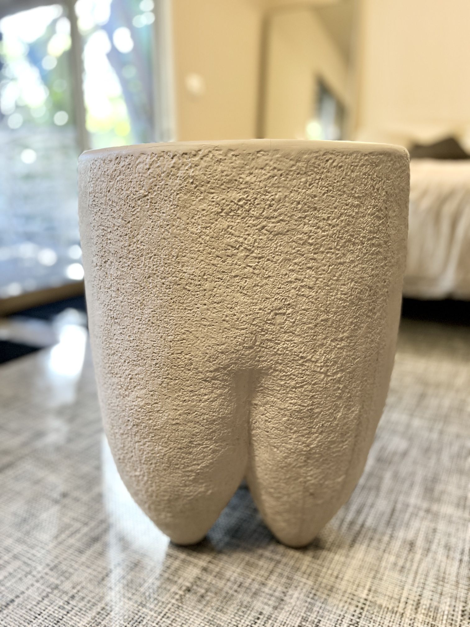 Noir Donald side/end table Unique pedestal design! Purchased new at $762 White fiber cement Suitable indoors or outdoors We used on patio next to pool Some minor wear on top of table but in great shape Dimensions: 24'' H X 18'' W X 18'' D Weight : 45 lb Pick up near 125/94 in La Mesa Delivery available for a fee