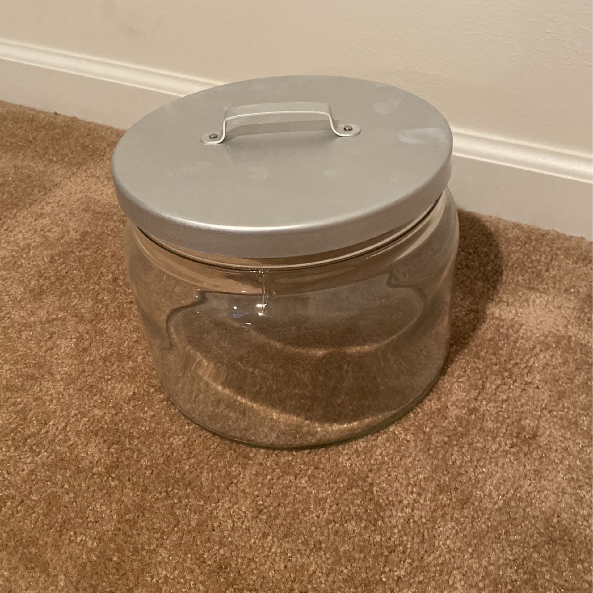 Glass Jar w/Aluminum Lid - approx 6” tall and 6” wide - $5
