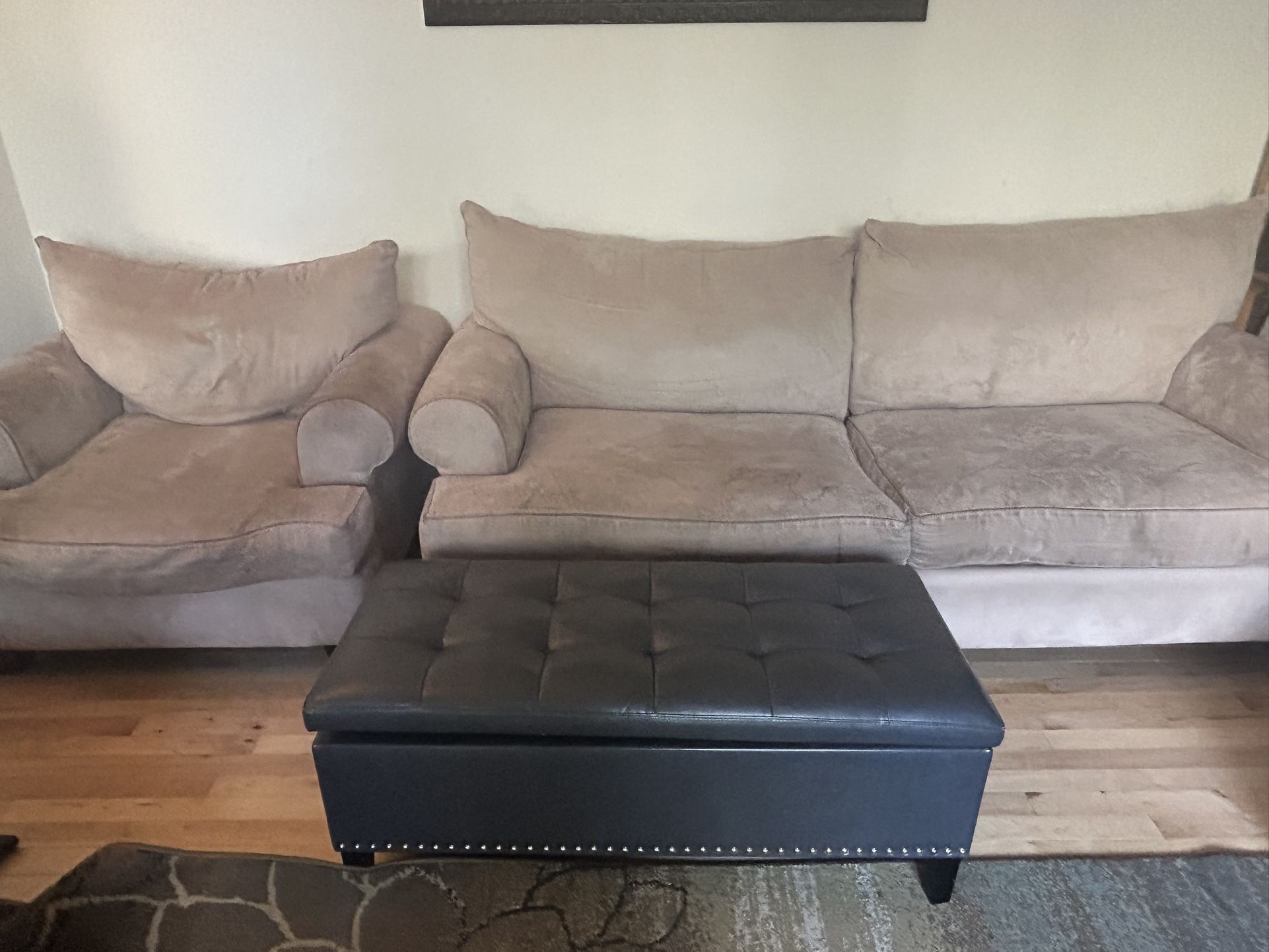 ***FREE - Need these picked up in Lake Stevens Saturday 1/24 since our new couch arrived*** Free used condition couch and armchair. Could use a cleaning but pet free and smoke free house. Includes the gently used reversible couch cover (grey one side, beige on the other side). Also will throw in the grey storage ottoman for free if you take the couch and chair. ***If you can pick up in Lake Stevens Saturday 1/24, please message me with a specific time and confirm you have a truck.*** Dimensions… Couch: 88” wide, 40” deep Chair: 43” wide, 40” deep