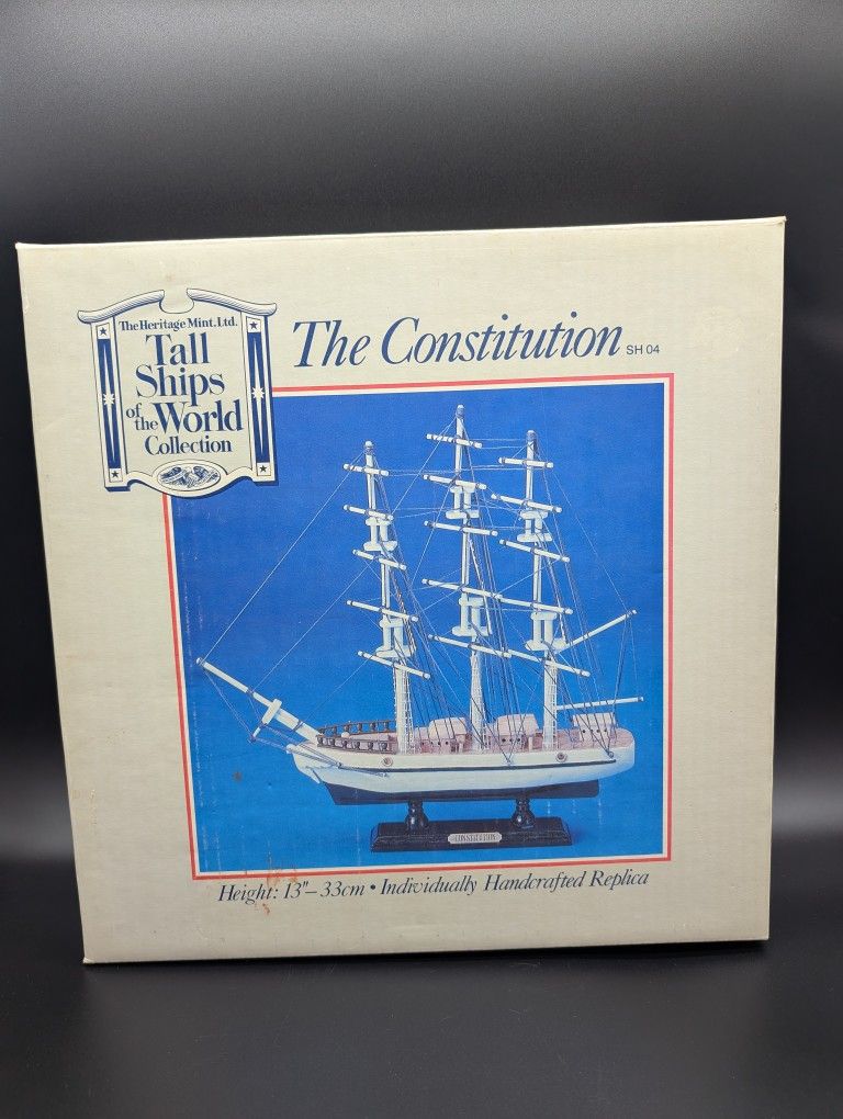 The Heritage Mint Ltd. Tall Ships of the World Collection. The Constitution Model #SH 04 Height: 13" Individually handcrafted replica, painted white & black. Meticulously detailed. Brand new in box. Offers welcome Cross-listed - don't wait! Please see all photos. Photos are considered part of the item description. The Constitution: By an act of Congress, the United States Navy was founded with the building of 6 frigates. One of the frigates was the USS Constitution, a 44-gun frigate built in Boston, Massachusetts, in 1797. The Constitution is most famous for her role in the War of 1812 with Great Britain. The first duel between the British and American navies took place on August 19, 1812. The Constitution fought and won a notable action against the British 38-gun frigate Guerriere - an achievement which earned her the nickname 'Old Ironsides' - in which she received little damage. The sailors called her Old Ironsides because so many British cannon balls bounced harmlessly off her thick sides. She captured the British Java later that year, and followed these victories with another in 1815, against the Cyane and Levant. The Constitution continued under Navy commission and active duty until 1851. At that time, she was refitted as a school ship. She was used at Annapolis, Maryland during the civil war as a school ship for midshipmen. In 1878 she took her last cruise into foreign waters, carrying US exhibits to Havre France for the Paris Exposition. She ran around at Swanage Point, England, and was salvaged with the aid of the English Navy. She was brought back to Boston harbor for repairs and used again as a training ship until 1900. At that time she was placed on permanent exhibition at the U.S. Navy Yard, Boston. She has undergone repairs through the years, and is currently serving as a ship museum. She carries the honor of being the oldest commissioned vessel in the U.S. Navy.
