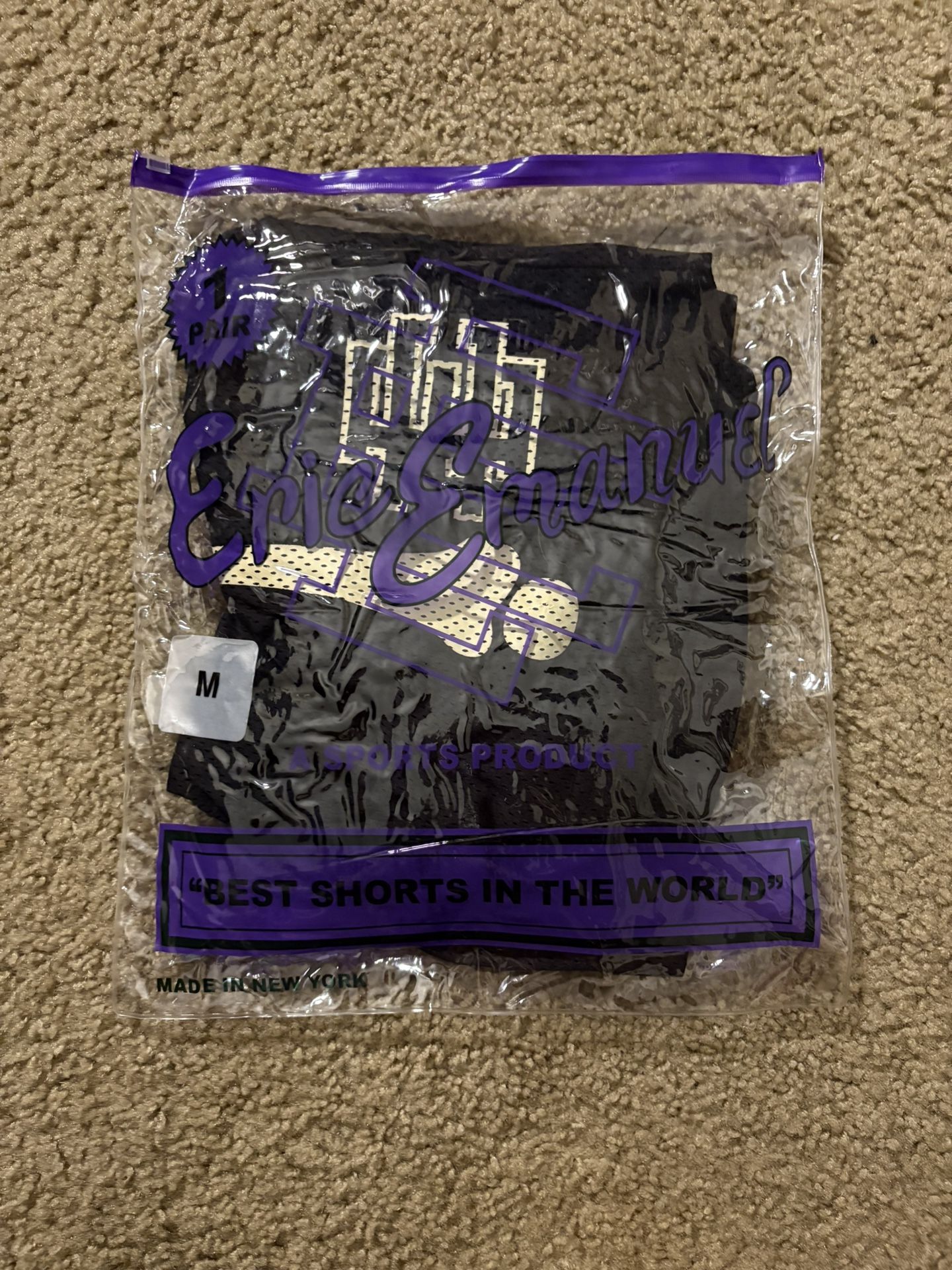 The Eric Emmanuel EE Bones Logo Shorts in black and white, size medium, feature a drawstring closure for a comfortable fit. These casual sweat shorts have a mid-rise with a 6-inch inseam, making them perfect for summer days. Made of breathable polyester material, they also have a logo accent and slash pockets for added style and functionality. With a regular fit and flat front design, these shorts from the Eric Emanuel brand are a great addition to any man's wardrobe.